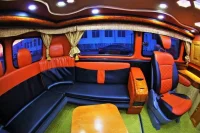 Убранство этой «Буханки» не имеет ничего общего со стандартным автомобилем, ибо новое здесь буквально всё: от конструкции крыши и окон до пола и шумоизоляции. Оформив салон в изысканном сочетании натуральной кожи и лакированного дерева, монгольские мастера установили в нем барную стойку, большие светодиодные светильники, отдельную мультимедийную систему и даже телевизор. Добавить уюта могли бы темные шторы, крепления для которых предусмотрены по всему периметру кузова.